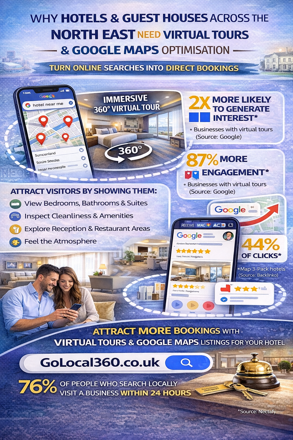 Go Local 360 helps hotels and guest houses across the North East improve their visibility through immersive Matterport virtual tours and expert Google Maps optimisation.