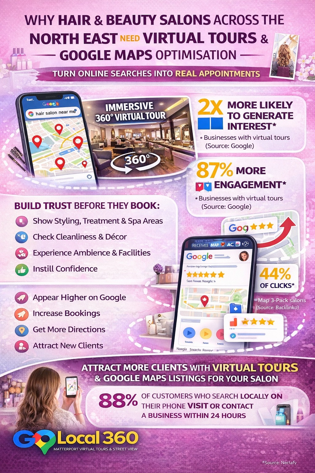 Go Local 360 helps hair and beauty salons across the North East improve their visibility through immersive Matterport virtual tours and expert Google Maps optimisation.